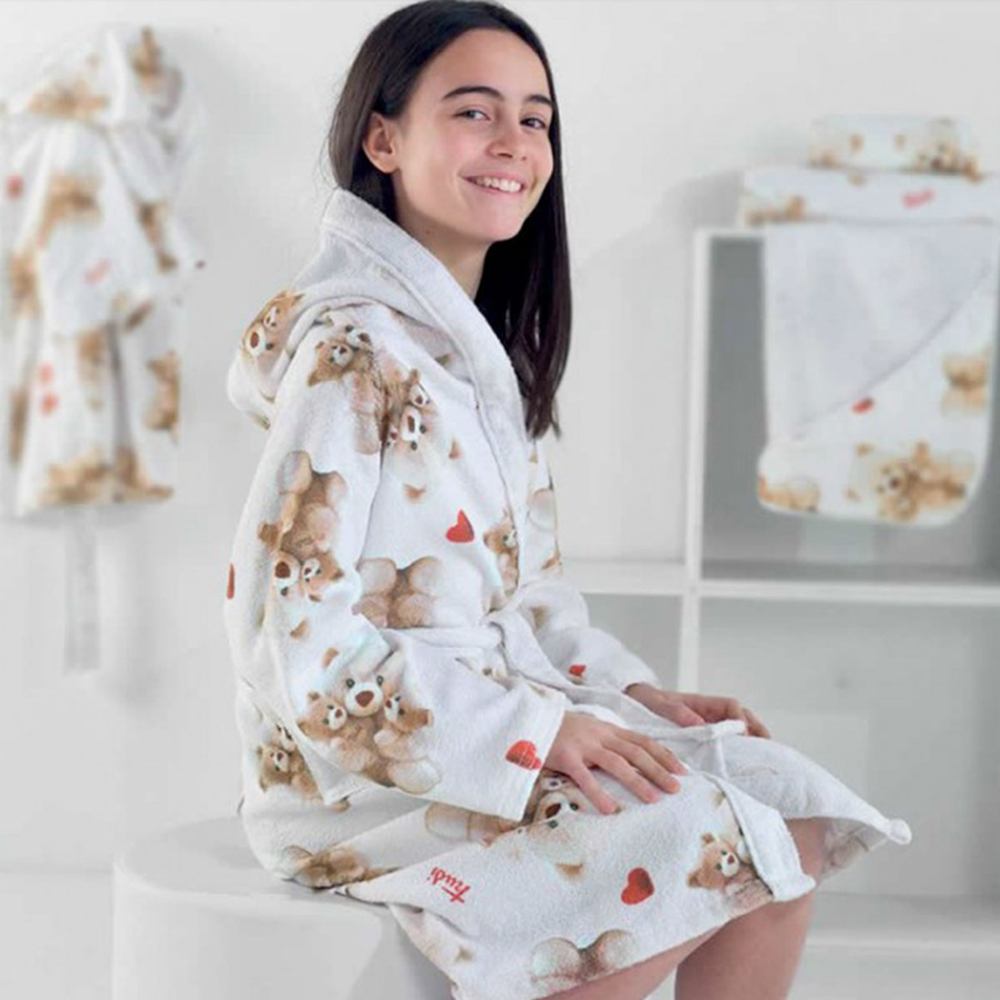 Accappatoio baby COCCOLE Trudi stampato su morbida spugna di puro cotone idrofilo.