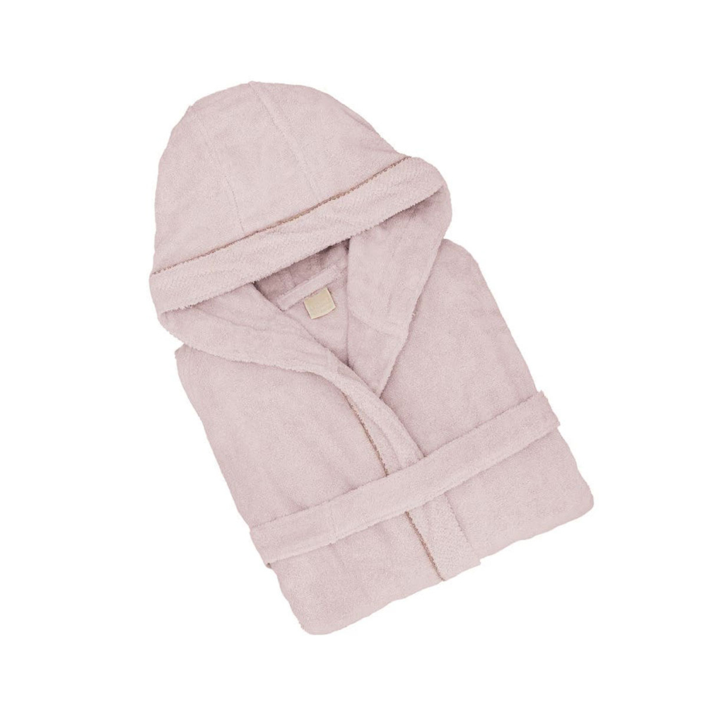 Accappatoio unisex con cappuccio in spugna di spugna di puro cotone idrofilo con applicazione su girocapo e tasche di spugna jacquard; inserimento profilo in lino a contrasto.