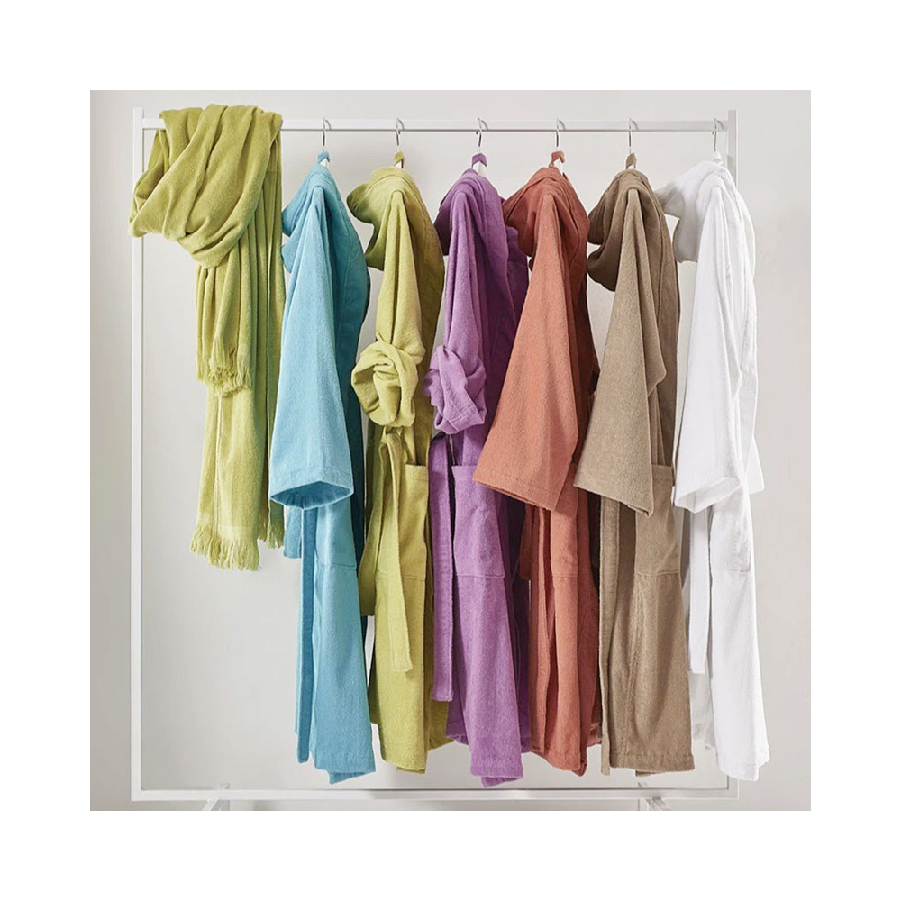 Accappatoio con cappuccio realizzato in leggera micro spugna di puro cotone. in tinta unita.
