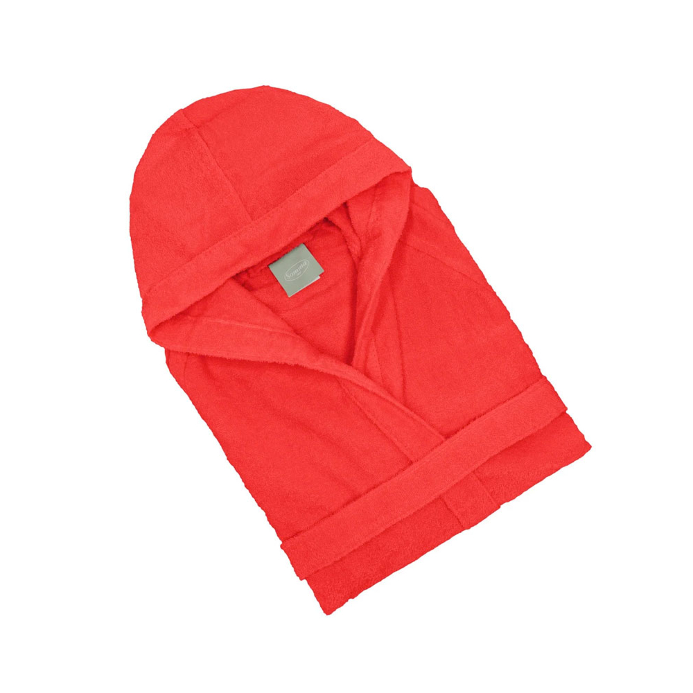 Accappatoio con cappuccio realizzato in leggera microspugna di puro cotone idrofilo.