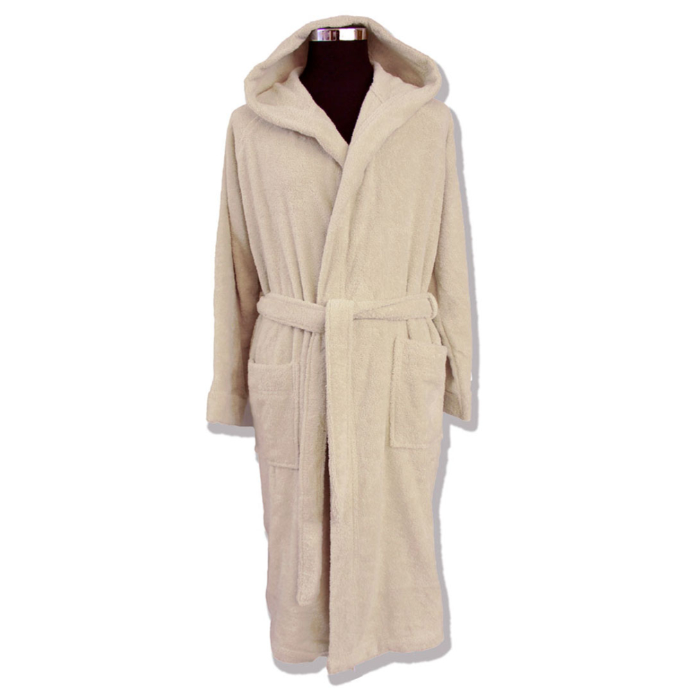 Accappatoio con cappuccio realizzato in spugna di puro cotone pettinato tinto filo.