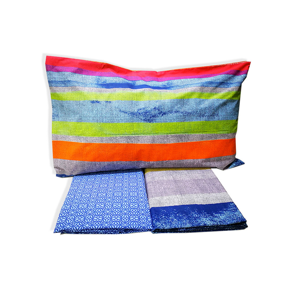 Il sacco copripiumino e la federa in double-face hanno una stampa a righe multicolore, mentre il sotto con angoli ha una stampa a fantasia.