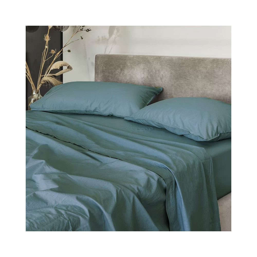 Completo letto lenzuola in tinta unita di puro cotone con effetto stropicciato lavato in capo, con effetto denim delavè, con le caratteristiche cuciture a 2 aghi.