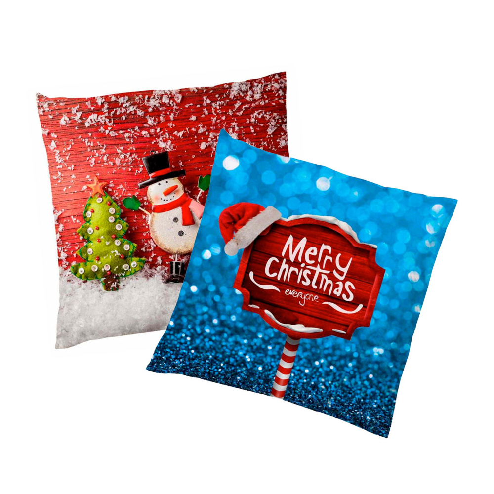Cuscino arredo natalizio double face con interno e non sfoderabile, da un lato la scritta Merry Christmas everyone su fondo azzurro, dall'altro un pupazzo di neve e decorazioni natalizie su un fondo rosso.