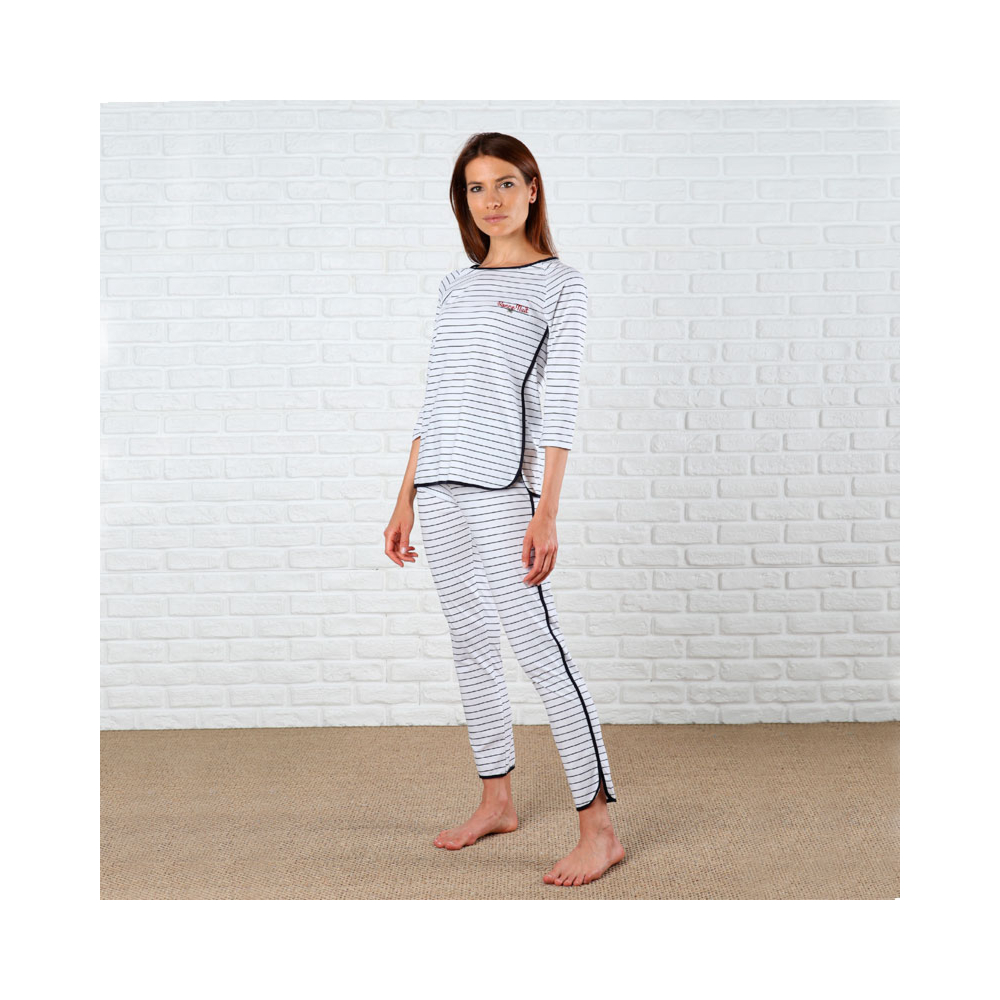 Pigiama donna con manica 3/4 e pantalone lungo in fresco jersey tinto filo in 100% cotone, a righe Saint Tropez e bordi a contrasto. Scollatura girocollo.
