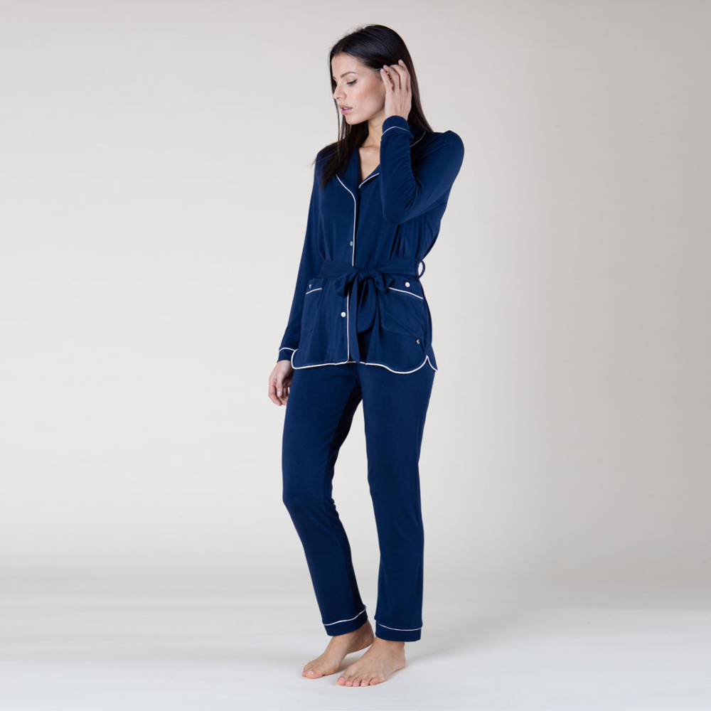 Pigiama donna con manica lunga e pantalone lungo aperto avanti in jersey con sottili profili in contrasto colore.