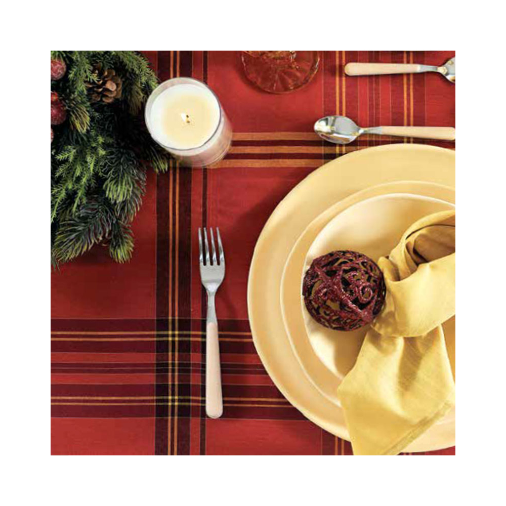 Runner centrotavola realizzato in cotone e altre fibre, in tessuto tartan scozzese tinto filo impreziosito da dettagli dorati, che presenta la classica fantasia caratterizzata da un particolare disegno ottenuto con fili di colori diversi che si ripetono con uno schema definito, uguale sia nell'ordito che nella trama.