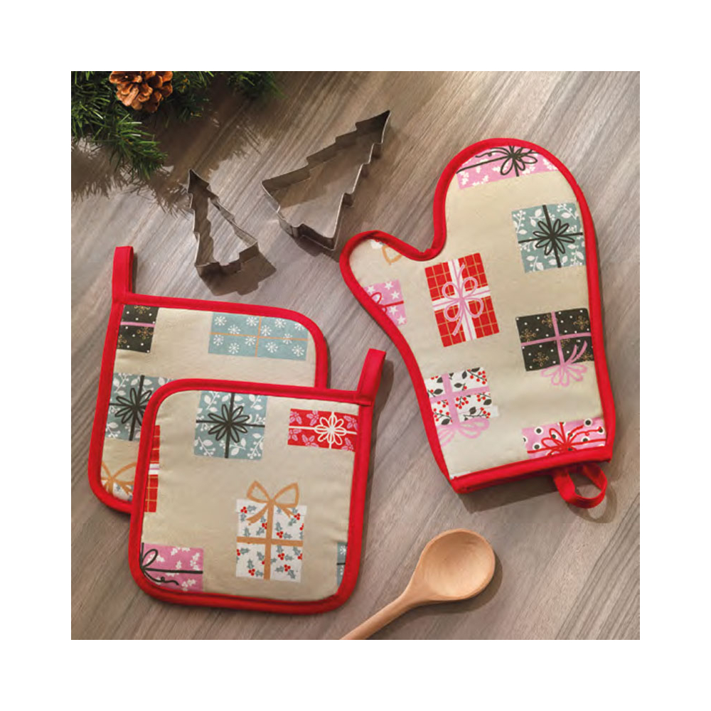 Set cucina natalizio composto da 1 guanto e 2 presine stampato su panama di puro cotone e imbottito con tessuto di puro cotone.
