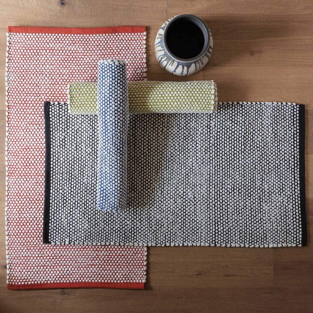 Tappeto arredo da interno in cotone tessuto a mano. Adatto a tutti gli ambienti, come soggiorno, camera e bagno.