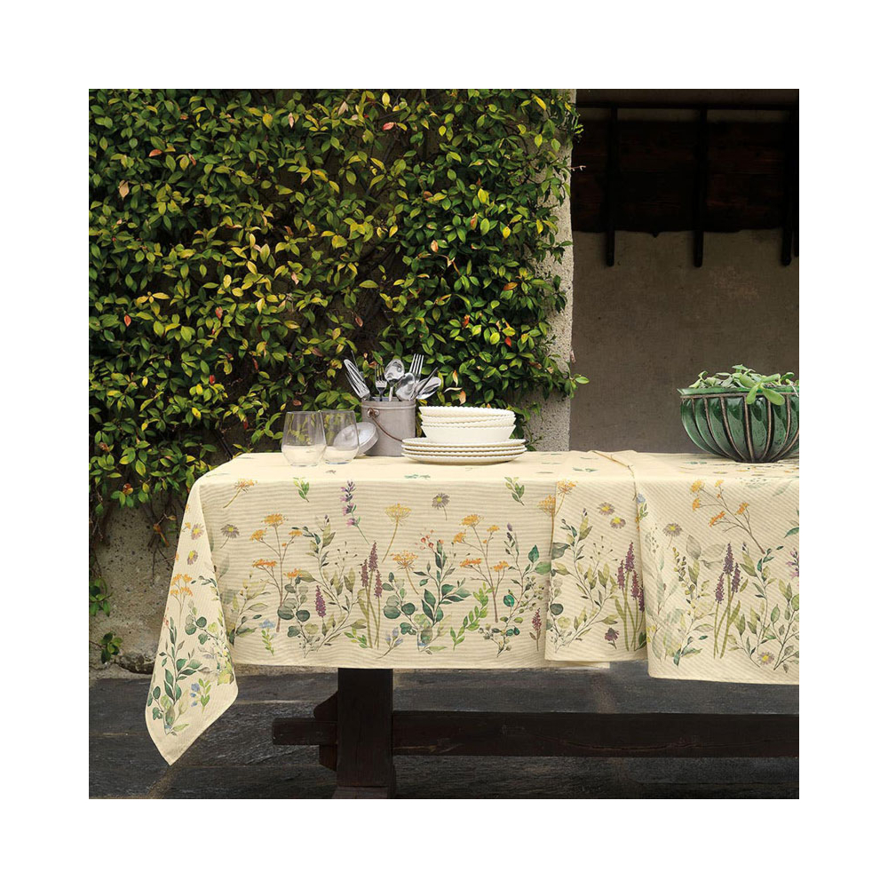 Tovaglia rettangolare stampata con tecnica digitale su panama di puro cotone, senza tovaglioli, con motivo piazzato.