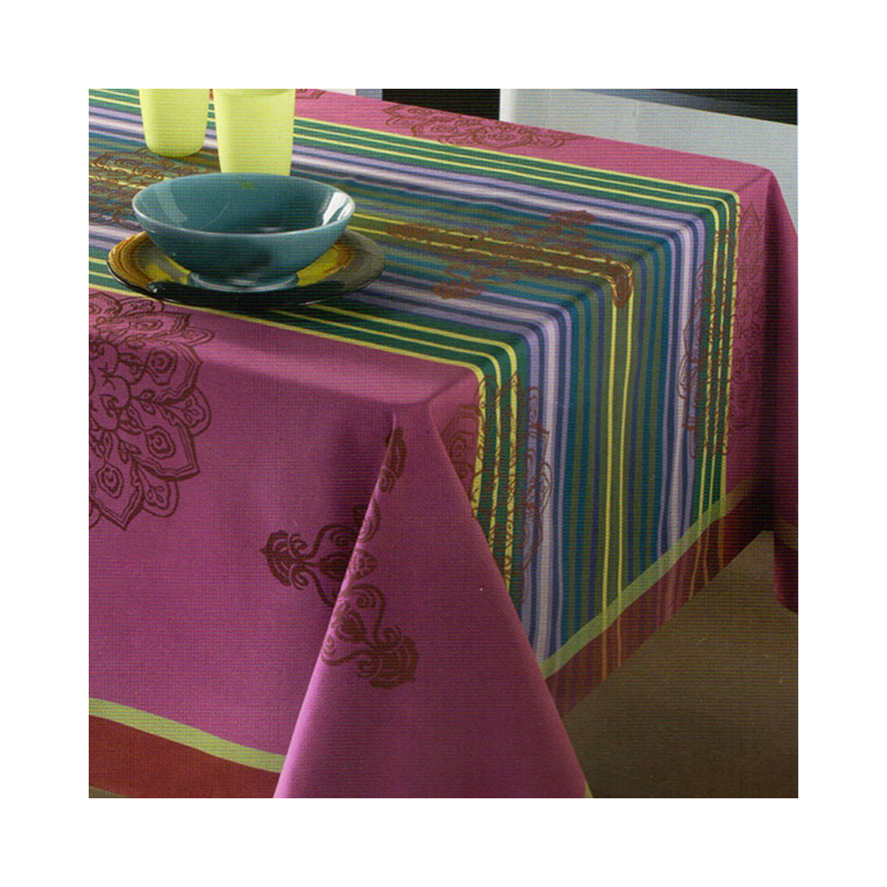 Tovaglia-copritavolo rettangolare Vallesusa (senza tovaglioli), tessuto jacquard di puro cotone, con una fantasia centrale a righe colorate.