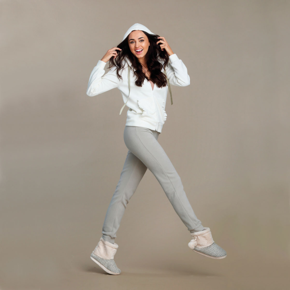 Tuta casa da donna con cappuccio, manica lunga e pantalone lungo in pile jacquard garzato su due lati.