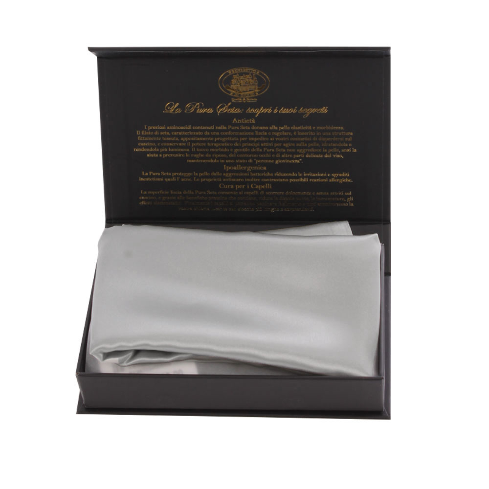 Il filato di seta, caratterizzato da una conformazione liscia e regolare, è inserito in una struttura fittamente tessuta, appositamente progettata per impedire ai vostri cosmetici di disperdersi sul cuscino, e conservare il potere terapeutico dei principi attivi per agire sulla pelle, idratandola e rendendola più luminosa.
